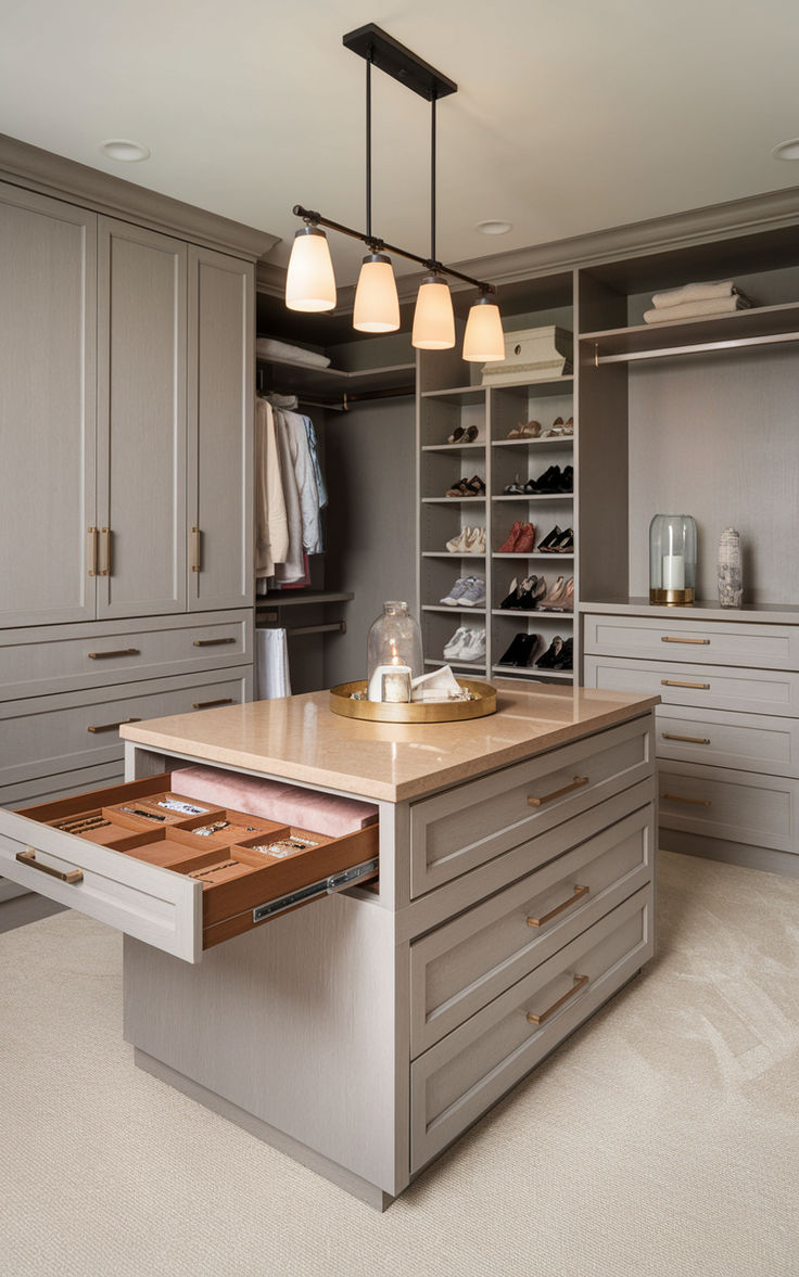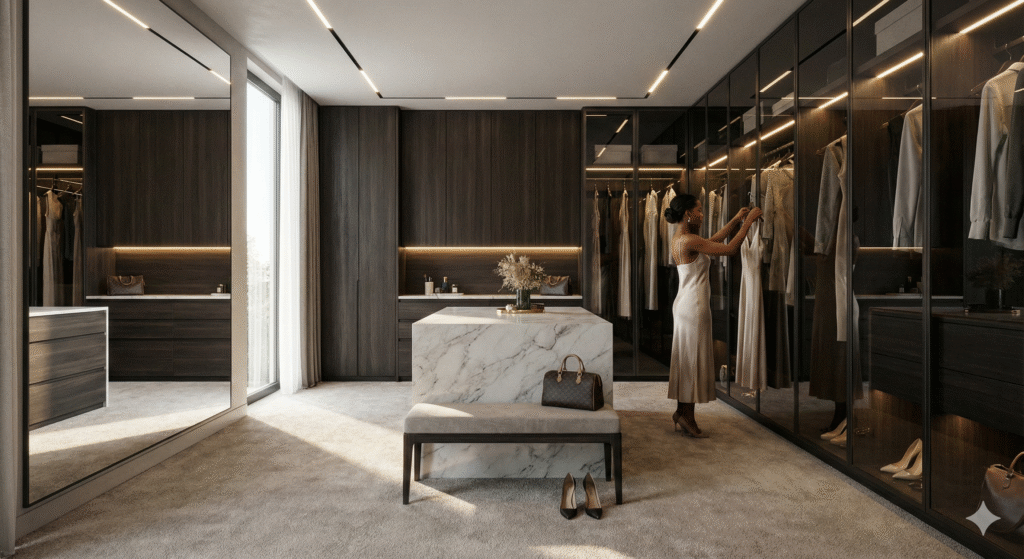 L’expérience boutique à domicile. Un dressing spectaculaire avec îlot central et finitions nobles, conçu pour ceux qui ne cachent pas leur style, mais le subliment.