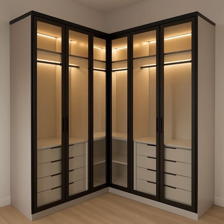 La transparence chic. L’alliance audacieuse du verre fumé et de l’aluminium noir pour un rendu moderne qui protège vos vêtements tout en les laissant visibles.